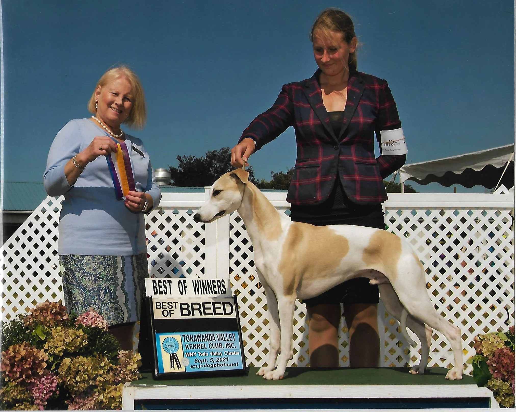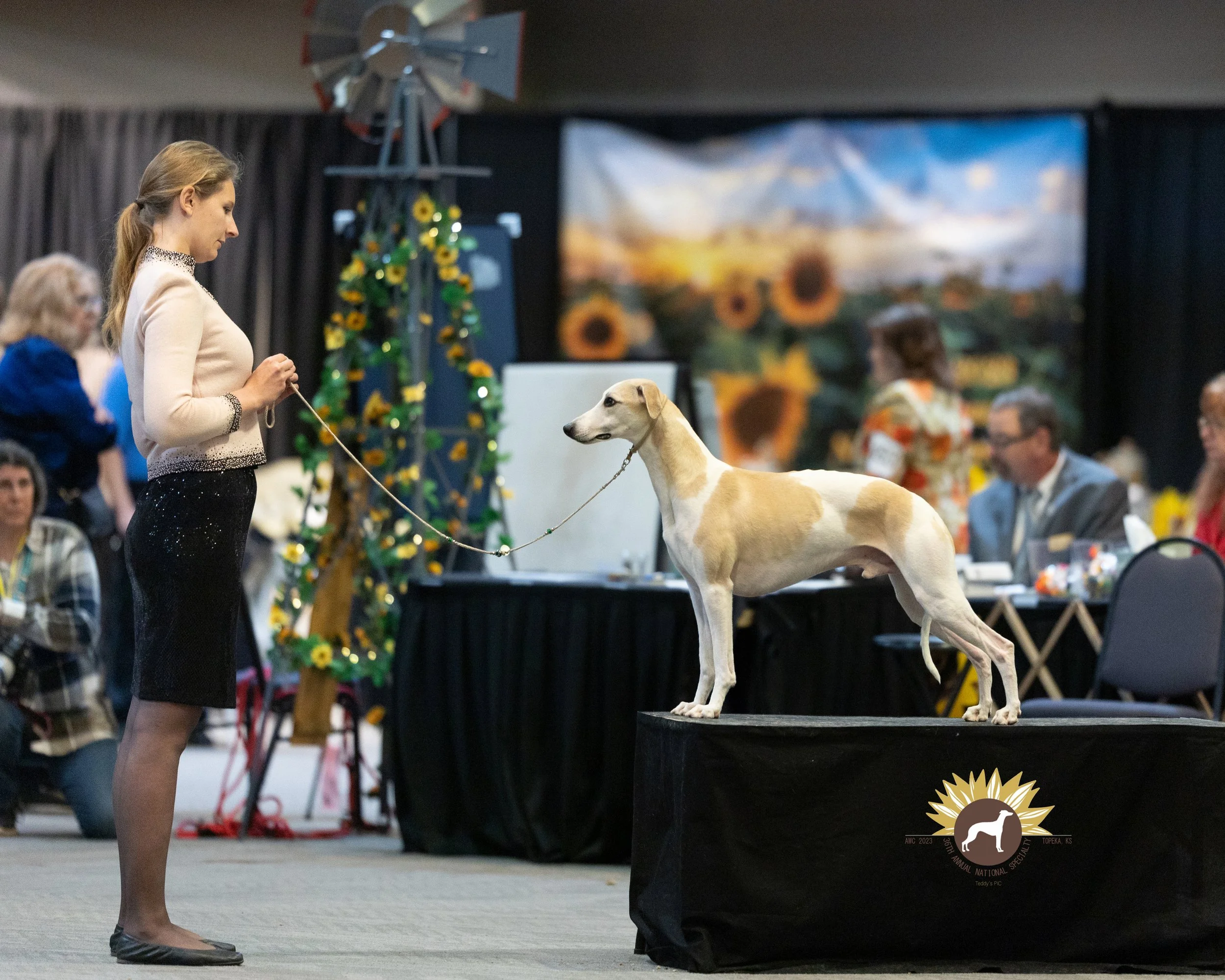 Tommy is our very handsome and athletic boy. He may be the youngest ever whippet to get his Dock Elite title at 10 months, he has shown extreme potential and versatility with coursing, agility, rally and obedience. His first ever year competing in the AWC triathlon (2023) he placed 6th out of close to 50 dogs. He so far has gone on to prove himself very well as a sire with his first champion get attaining his championship undefeated and at 9 Mo, with other littermates close behind!